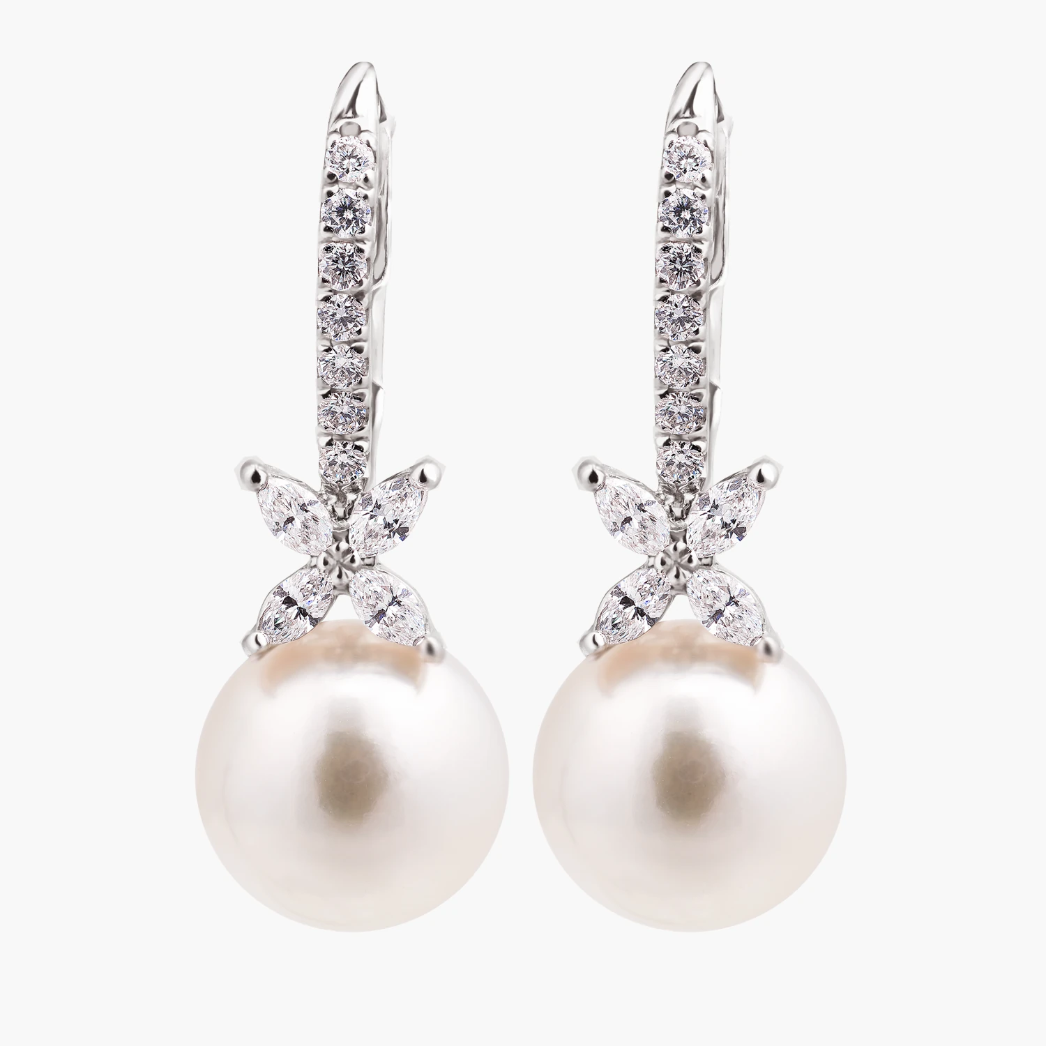 Ztělesnění čisté elegance a královského půvabu. Mořské perly Akoya s hlubokým hedvábným leskem doplňuje rafinovaná kompozice diamantů. Precizní brus marquise v podobě lístků dodává šperku dynamiku, zatímco drobné kulaté diamanty podtrhují jeho jemnost a zajišťují nepřetržitý třpyt při každém pohybu. Tyto náušnice jsou symbolem vytříbeného vkusu, ideální pro ženu, která miluje tradici v moderním, luxusním hávu.